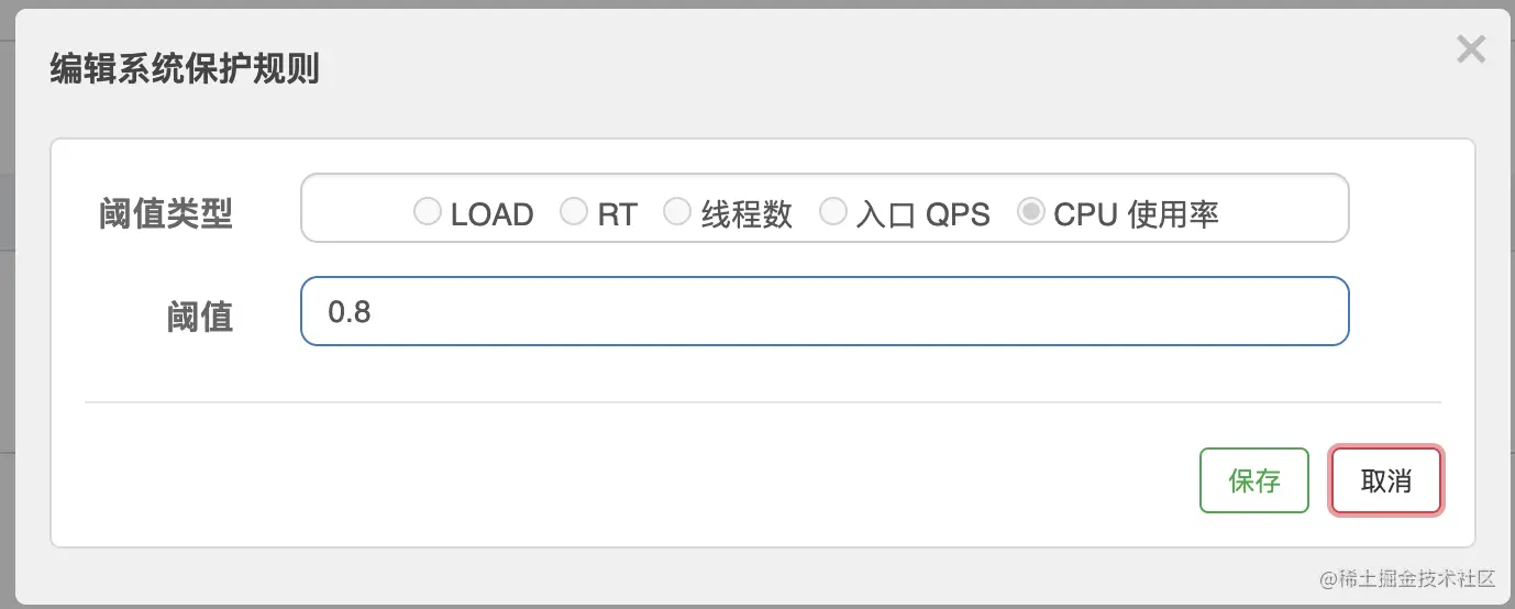 针对如上情况,我们尝试使用Sentinel的系统规则,在系统负载过高的时候自动进行熔断,避免系统过载导致被击穿,我们设置一条CPU不超过80%的系统保护规则,如下,通过后面几个过程,我们对比一下这条规则对我们系统的影响