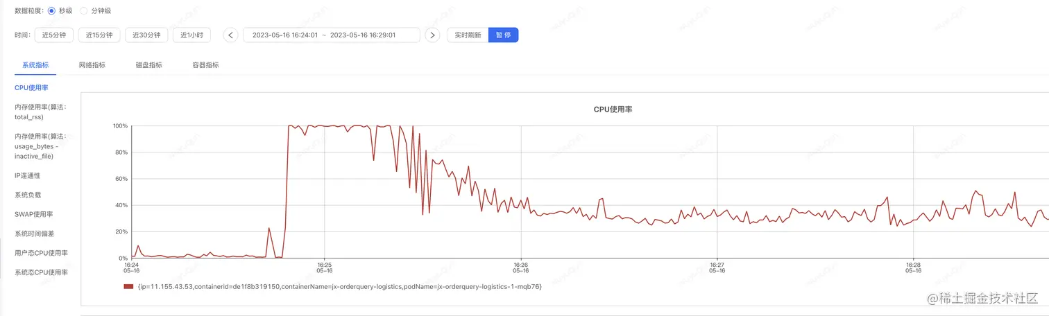 压测端在高CPU阶段QPS上不去,仅在50-100之间波动,CPU恢复之后,QPS迅速上涨到400,整个过程Sentinel无熔断发生