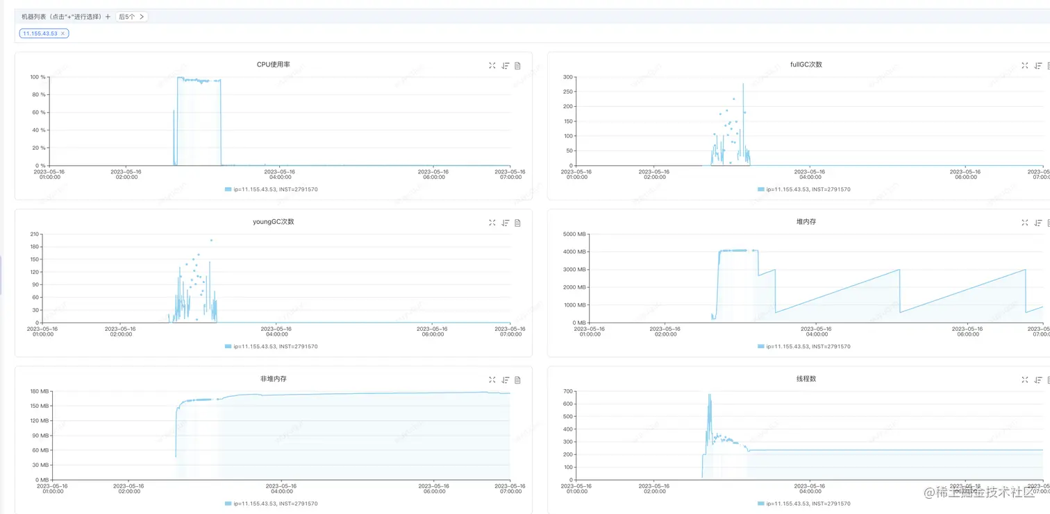 在今天ForceBot全链路压测中,有位同事负责的服务做Serverless扩容(负载达到50%之后自动扩容并上线接入流量)中,发现新扩容的机器被击穿,监控如下(关注2:40-3:15时间段的数据),我们可以看到,超高CPU,频繁FullGC,并且每次FullGC之后对内存并不回收(见FullGC时间段对应的堆内存的曲线,是一条横线)