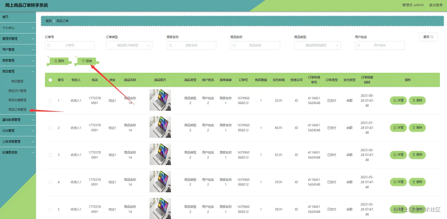 商品管理(订单、商品评论、回复、商品统计报表、接单、转单、发货、收货、退货等)