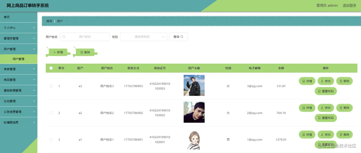 如图显示的就是用户信息管理页面,此页面提供给管理员的功能有:用户信息的查询管理,可以删除用户信息、修改用户信息、新增用户信息,还进行了对用户名称的模糊查询的条件