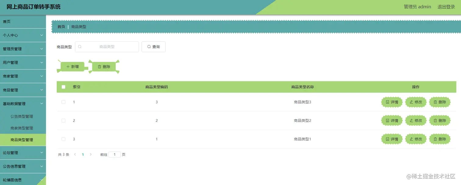 如图显示的就是商品信息管理页面,此页面提供给管理员的功能有:查看已发布的商品信息数据,修改商品信息,商品信息作废,即可删除,还进行了对商品信息名称的模糊查询 商品信息信息的类型查询等等一些条件