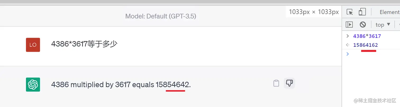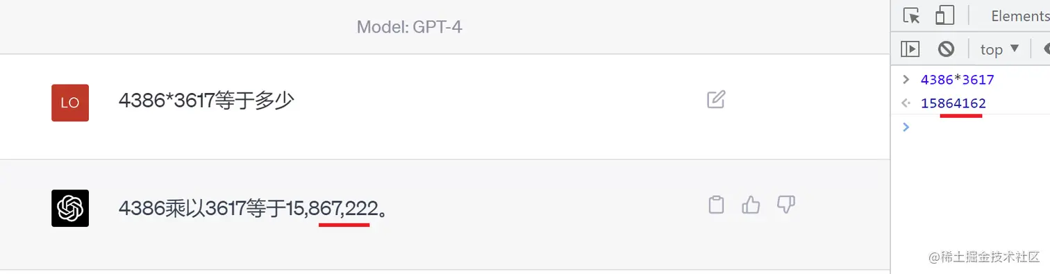 例如,ChatGPT完全做不了4位数的乘法运算,它大概率会根据6乘和7等于这2块关键信息,得到答案是以2结尾,根据4和乘以3这2块关键信息,得到答案是以1开头,而中间的随机性完全收敛不到正确的答案,不管是ChatGPT和GPT4都是一样的情况: