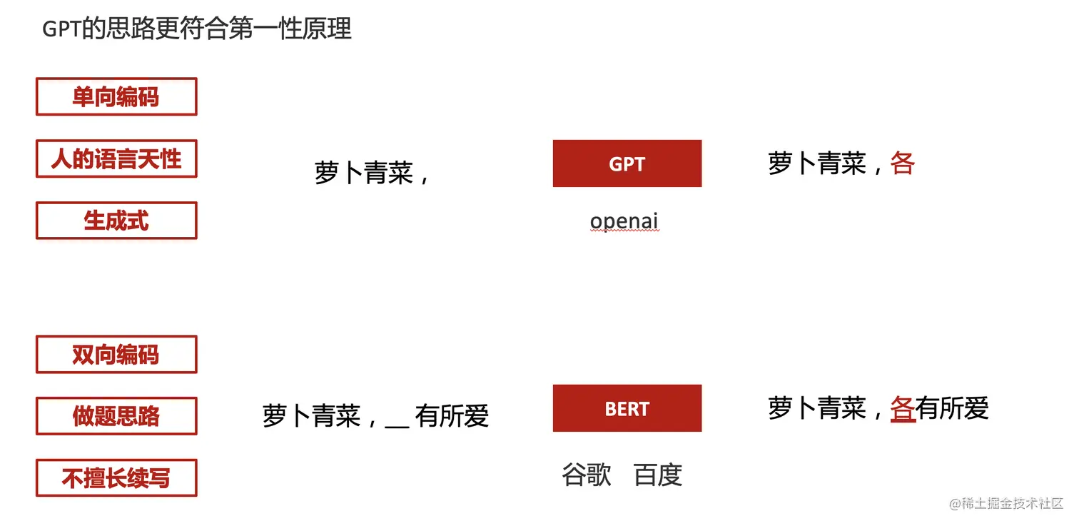 这里补充下GPT类似的BERT,他们都是基于后面提到的Transform结构,他们的对比如下,总的来说,文字接龙更服务人类大部分情况下的语言模式,因此像马斯克也更青睐于这种第一性原理的东西。