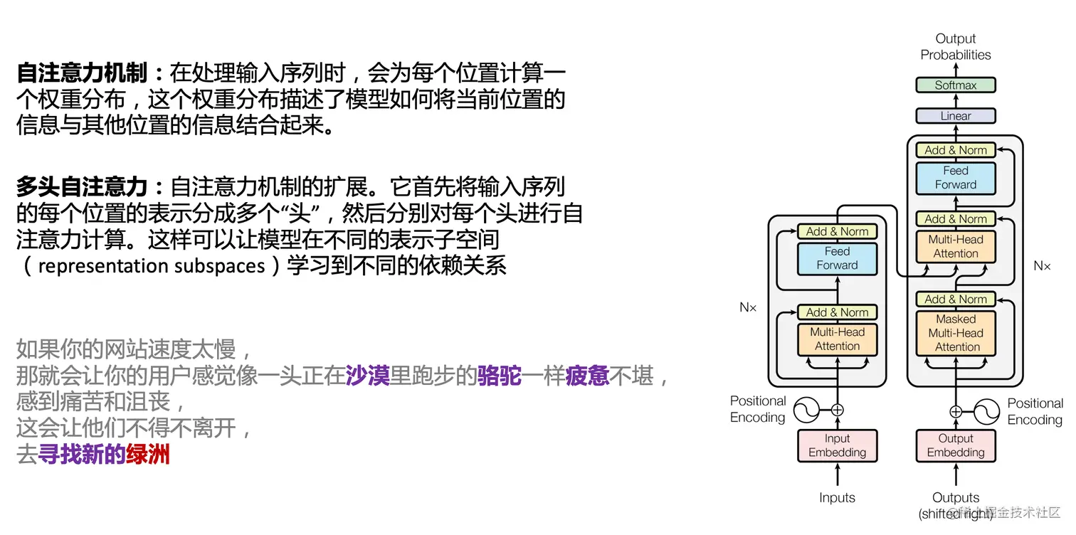 在这个Case中,绿洲的出现,反而不是因为最近的寻找新的,而是3句话之前的沙漠和骆驼。这里就不得不提到大名鼎鼎的Transform结构,这是Google在2017年在一篇论文 《Attention is all you need》首次提出的一种类神经网络结构,它和核心是自注意力机制,用来解决长距离文本的权重问题。