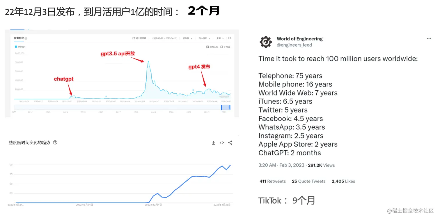 ChatGPT作为一个web应用,自22年12月发布,仅仅不到3个月的时间,月活用户就累积到1亿。在此之前,最快记录的保持者也需要9个月才达到月活1亿。