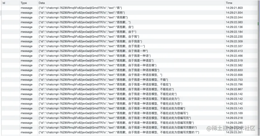 可以看到ChatGPT的输出是逐字输出的打字效果,这里应用到了SSE(SeverSideEvent)服务端推送的技术。一个SSE服务的Chrome开发工具化network截图 :