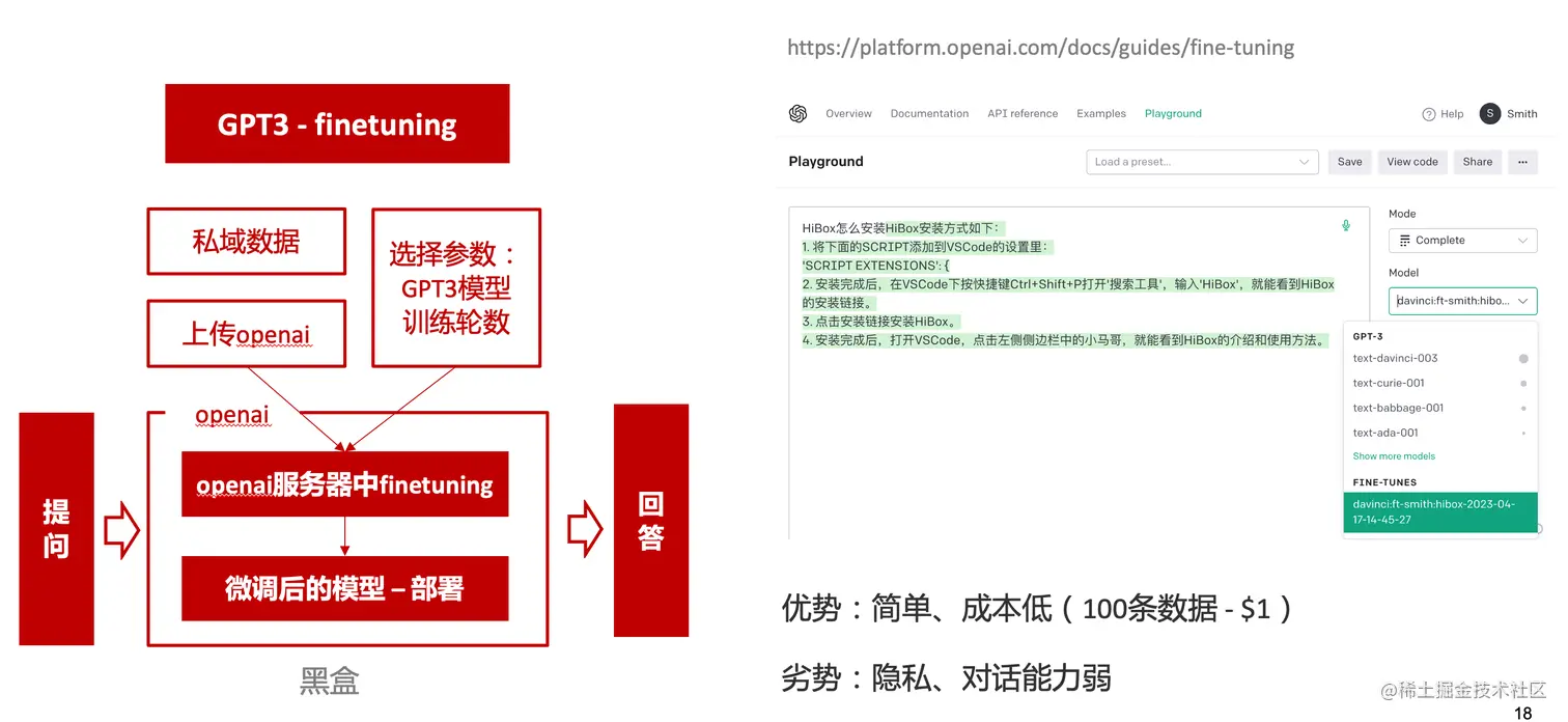 一是通过OpenAI官网提到的GPT3的fine-tuning接口,将私域数据传给OpenAI,OpenAI在他们的服务器里微调训练,然后部署在OpenAI的服务器中,整个过程是黑盒。