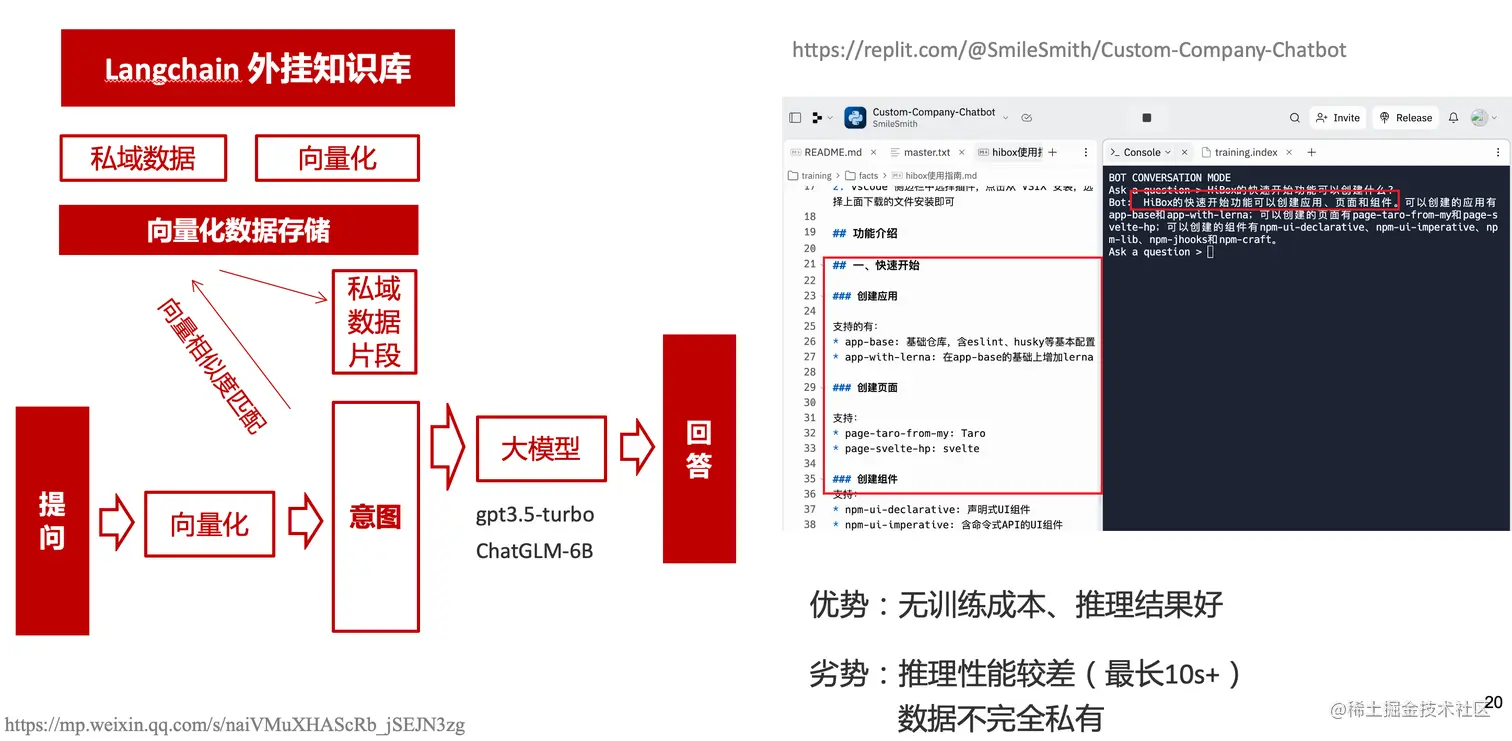 上面的两种方式总的来说,部署后的推理效果都很难达到GPT3.5-API的效果,因此我们最后尝试了embedding外挂知识库的方式。使用开源的langchain处理文档切割、向量化存储、向量化匹配等。数据还是会暴露给OpenAI。
