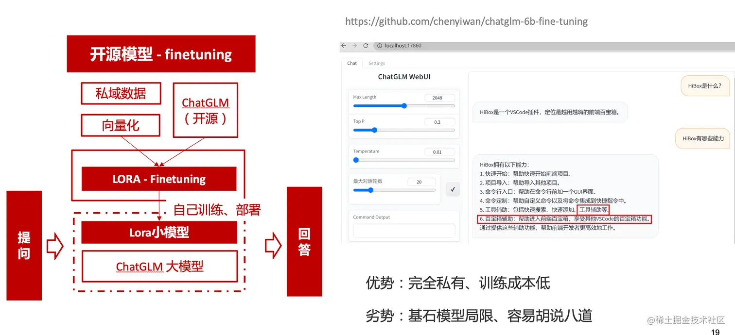 二是用清华开源的ChatGLM-6B作为基础模型,在公司的九数平台上申请GPU机器,将私域数据通过LORA的方式微调得到LORA权重,然后自己部署,整个过程完全私有化。