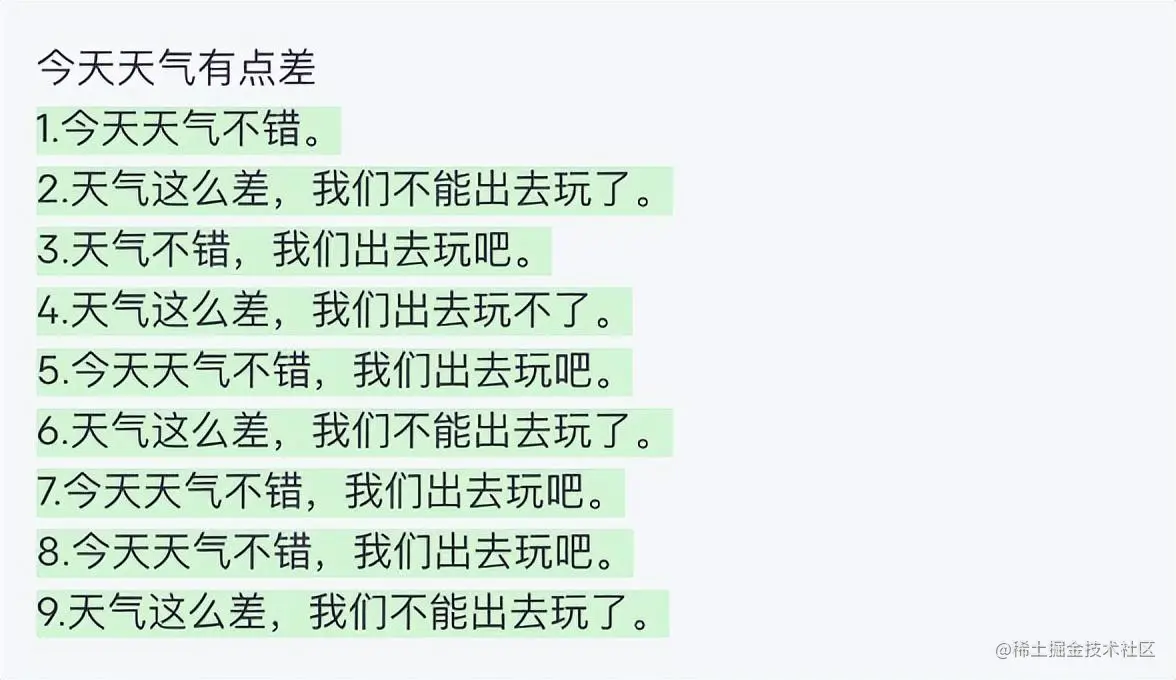 因为预训练是无人类的监督,因此通用模型不一定按照聊天形式返回文本,因为它的训练素材包罗万象,比如我说今天天气差,它根据历史的经验:今天天气差的表述方式有下面几种,就会输出这句话的不同的表述,而不是像聊天一样跟我一起吐槽 。下面的OpenAI的GPT3模型对今天天气差的输出: