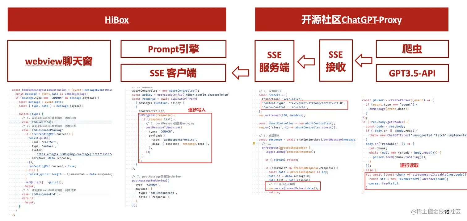 我们首先想到了VSCode插件,刚好HiBox本身有登录态、自定义Webview、远程配置化的能力,那就将ChatGPT集成到HiBox中(太酷啦),Node端接入ChatGPT的接口,通过Webview前端实现一个聊天窗,再通过配置系统集成常用的Prompt,这样前端开发就能通过VSCode方便地用到ChatGPT的能力。整体结构如下: