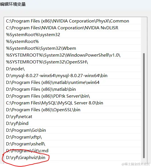 3、将Graphviz安装目录下的bin文件路径添加到系统环境变量中;
