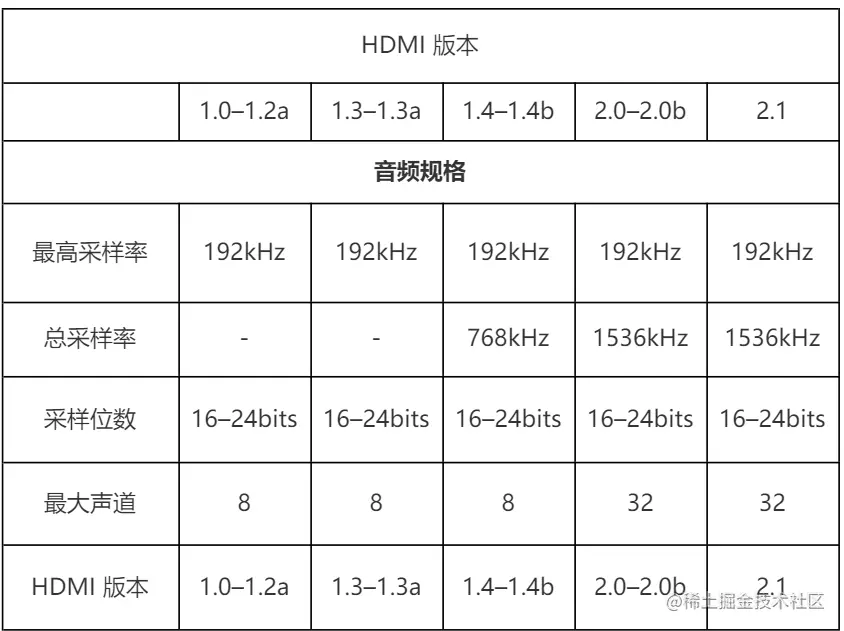 高清多媒体接口(High Definition Multimedia Interface,HDMI )是一种全数字化视频和声音发送接口,可以发送未压缩的音频及视频信号。HDMI可用于机顶盒、DVD播放机、个人计算机、电视、游戏主机、综合扩大机、数字音响与电视机等设备。HDMI可以同时发送音频和视频信号,由于音频和视频信号采用同一条线材,大大简化系统线路的安装难度。这块是百度百科对HDMI的简单介绍,我们再看看HDMI不同版本对音频的支持情况: