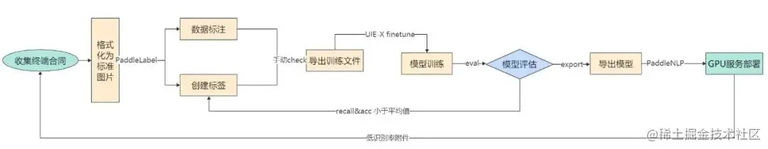 自然语言处理模型库 PaddleNLP 内的跨模态文档通用信息抽取模型 UIE-X ,以文心大模型为基础,在没有专业标注团队的情况下,使用小样本训练,进行定制化开发,大量节省了标注成本。在此基础上,数链只需准备几十份合同样本,使用飞桨智能标注 PaddleLabel 进行标注、训练,最终关键信息抽取精度达到87.5%。