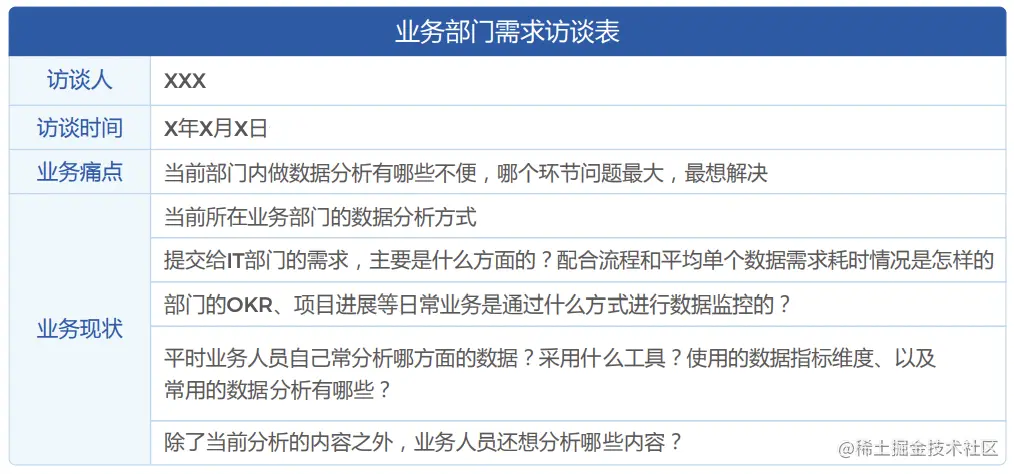 对于需要调研的每个部门,都应指定对应的数据对接人和业务对接人,当然也可以由同一个人兼任。项目经理需要分别 对各业务部门的「数据分析师」以及「业务人员」进行调研,配合完成数据情况整理。