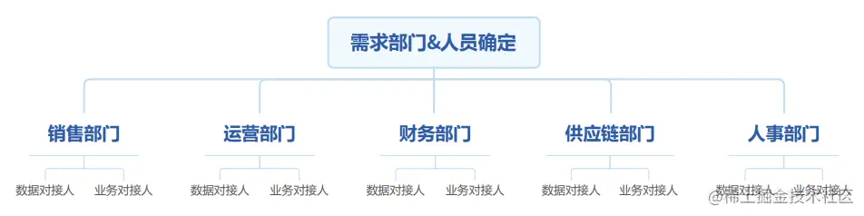 在调研业务部门分析场景前,首先要做的就是依据 BI 系统的使用者确定需要调研的业务部门,可以一次性调研所有希望用BI系统的业务部门,也可多次循环调研。