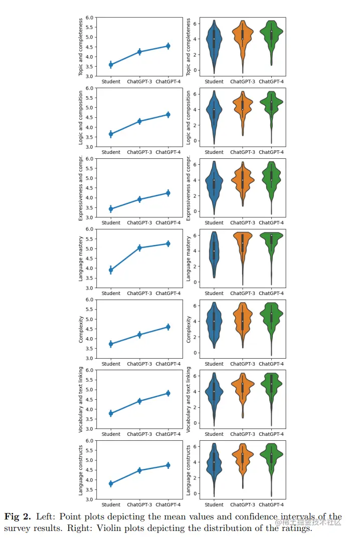 最终,整体文章评分的分值如上图所示,几乎对于所有的评价指标,都是学生撰写的文章评分最低,GPT-3.5 居中,GPT-4 评分最高,上图右侧的小提琴图可以带来更加直观的展示。