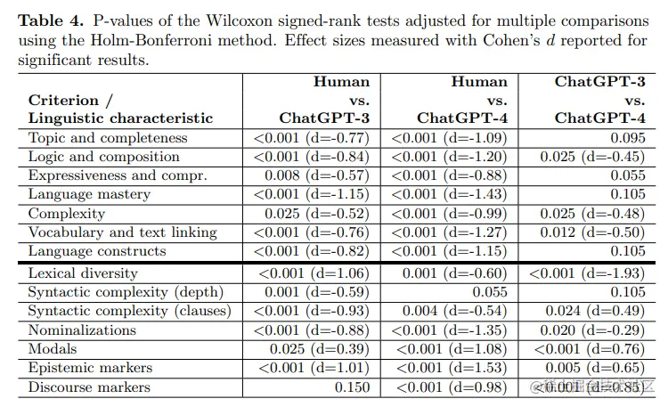 除了模型与学生写作之间的对比外,模型与模型之间的对比也能揭示一点模型的进步方向,如虽然 GPT-4 在几乎所有指标上的平均值都大于 GPT-3.5,但只有逻辑、词汇、文本链接与复杂度中差异是显著的,即 GPT-4 对 GPT-3.5 真正的提升主要来源于这四个方面。