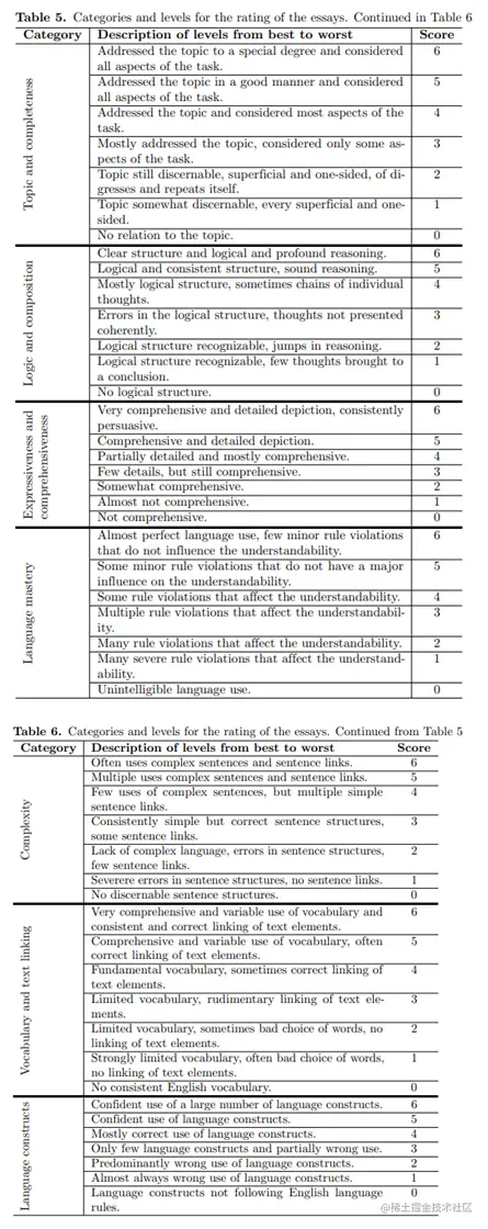 在获得了 AI 的写作文章后,论文作者又组织了针对评分者(高中老师)的关于 ChatGPT 基础知识的培训讲座,参与老师的主要所在学科包括语言(英语,法语和德语),宗教,伦理和科学等等。在两个小时的讲座与四十五分钟的讨论后,参与教师收到了关于文章评分的问卷,这份问卷包含了文章评估相关的七个评估标准,分别是: