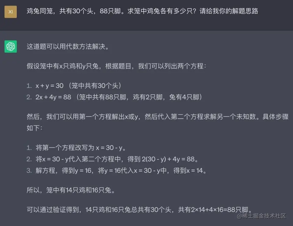下面我们用ChatGPT来演示一道鸡兔同笼题目,看看ChatGPT是如何帮助你和孩子的。