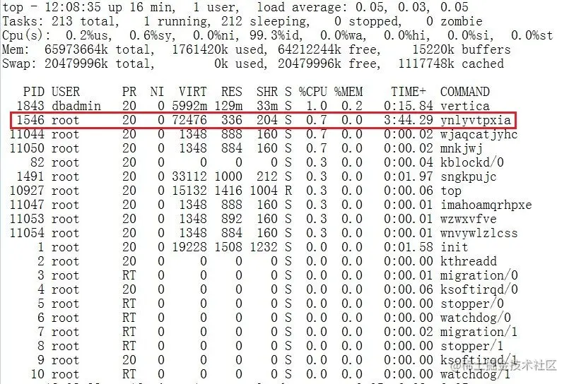 执行TOP命令,查看占用CPU较高的异常进程,一般多为80%以上,有个别病毒占用CPU可能不高,但是从command名称明显不是系统进程或用户进程,如TSM,Lixsyn,ynlyvtpxia等。