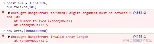RangeError 表示范围错误。将变量设置在其限定的范围之外、将值传递给超出范围的方法、调用一个不会终止的递归函数时就会抛出此错误。