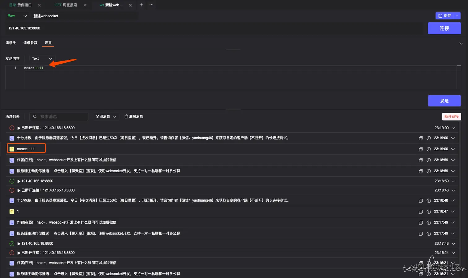 如果建立链接成功后并且出现发送按钮,说明建立连接成功。在参数名和参数值输入 name:1234,点击发送按钮。