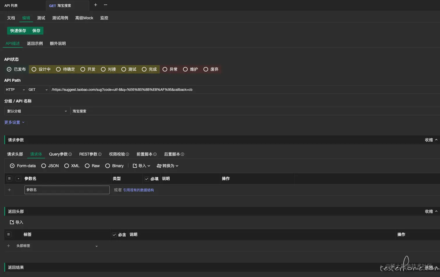 apipost 的创建接口页面,和 eolink、apifox 布局不太一样,感觉更像 postman 的页面布局。mock 数据需要在下边切换使用。