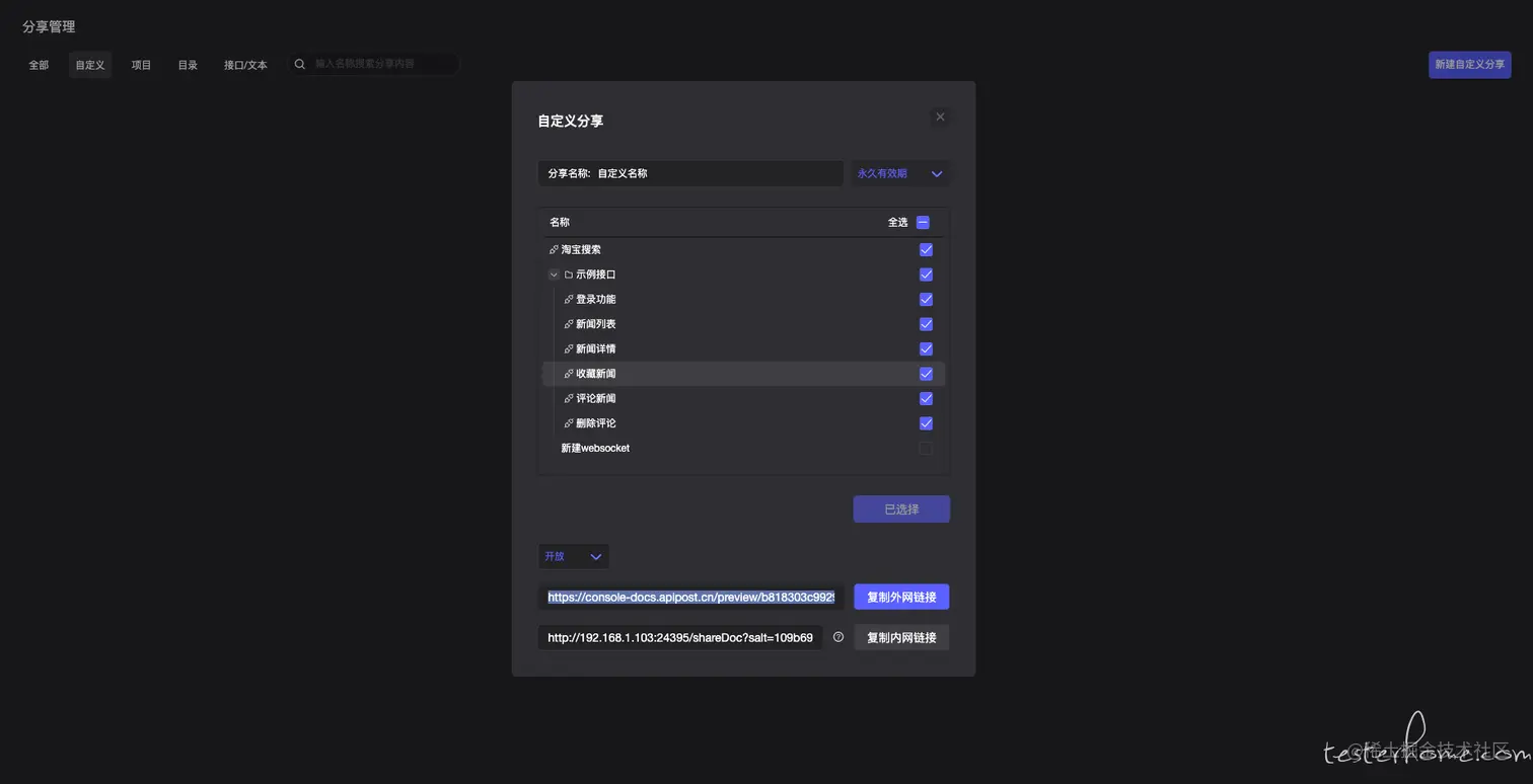 选择分享 tab 并且新建自定义分享,然后勾选需要分享的接口。会生成在线浏览地址,放到浏览器访问即可。