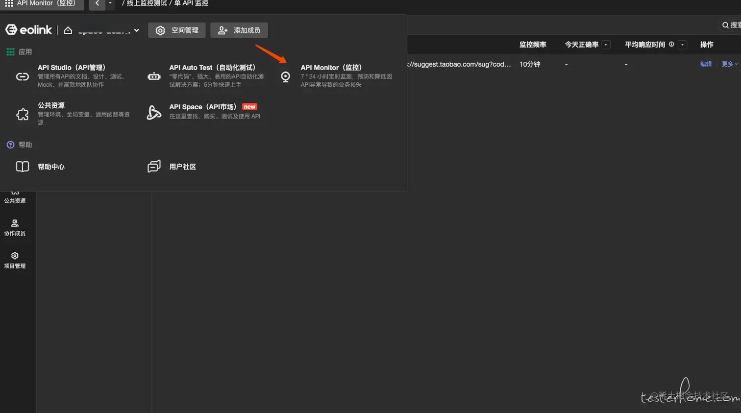 首先,在顶部选择 API Monitor 空间,解决 7 * 24 小时定时监控,预防和降低因为 API 异常导致的业务损失。