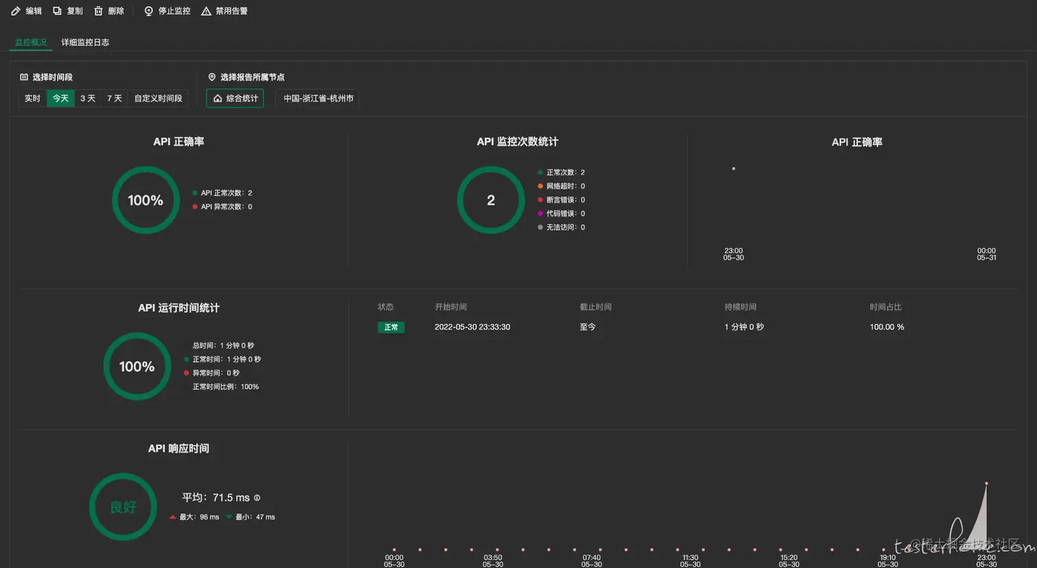点击开始监控后,就会按照 10 分钟的频率监控,如果出现错误会在大盘中展示,在最下面按照时序请求接口的折线图。
