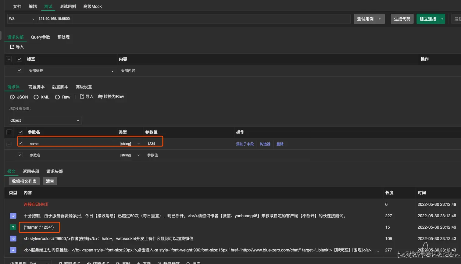 点击发送完成后,在报文内容部分可以看到{"name":"1234"},说明 WebSocket 协议消息发送成功。