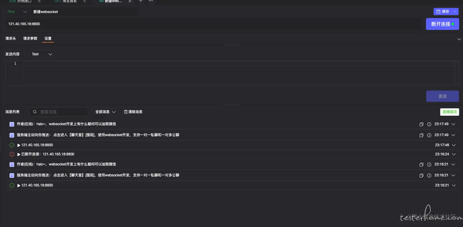 小结: eolink、apipost 都支持 WebSocket 协议测试,在使用过程中都可以很好的进行 WebSocket 测试。