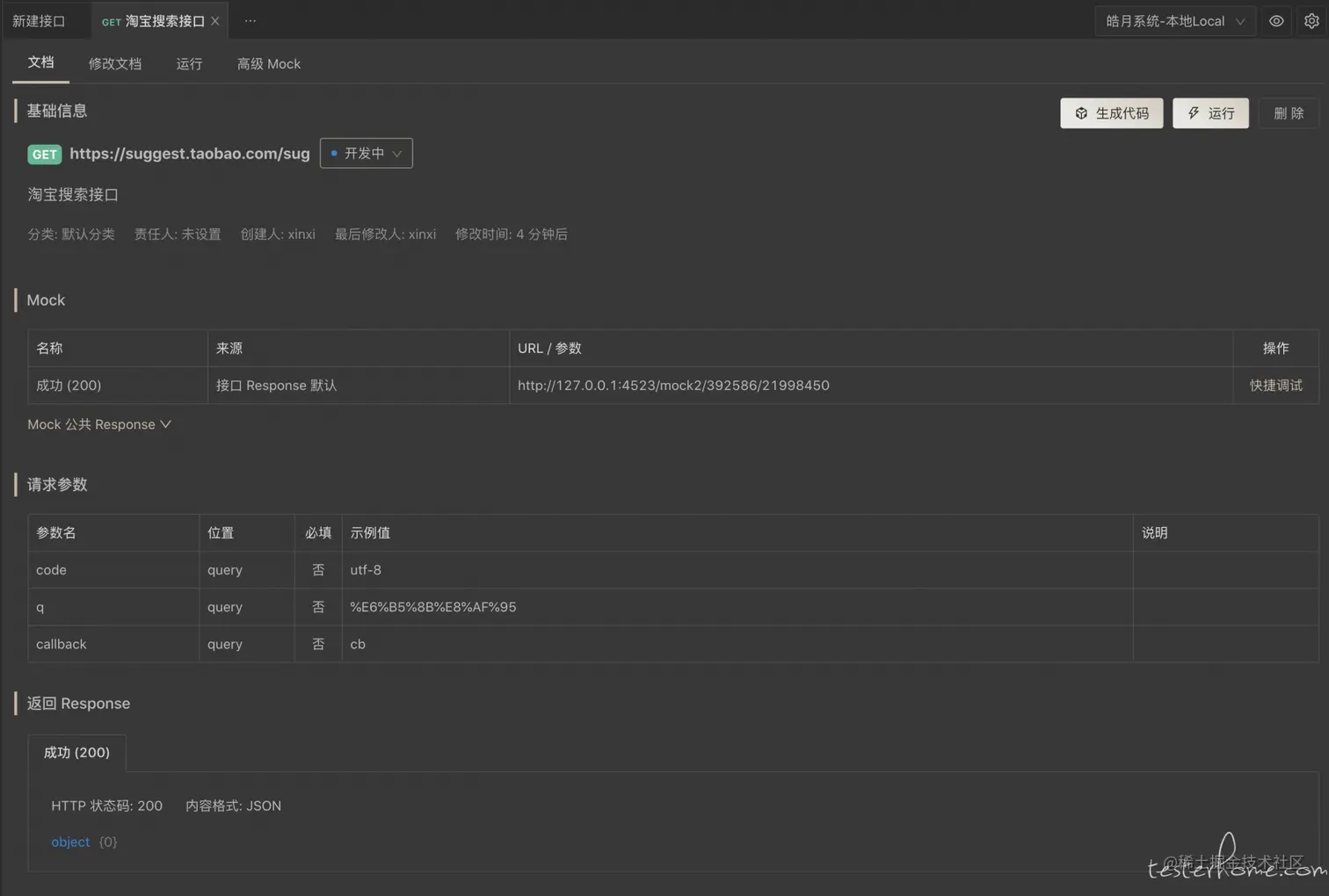 点击创建接口后,在顶部展示文档、修改文档、运行、高级 Mock 等四个功能。