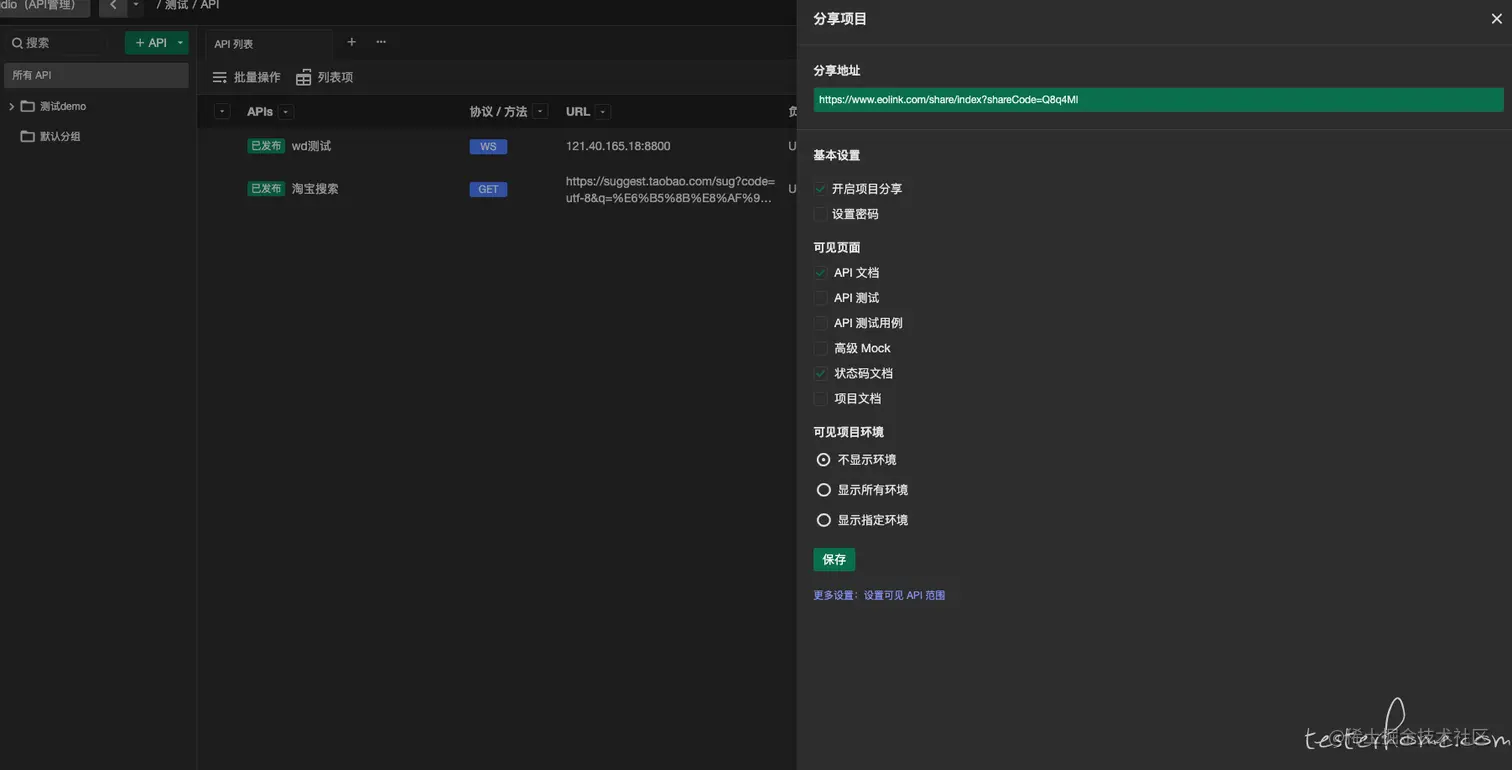 选择 API 并且点击分享项目按钮。点击开启分享,会自动生成分享地址,可以设置可见页面权限并且可以设置密码。