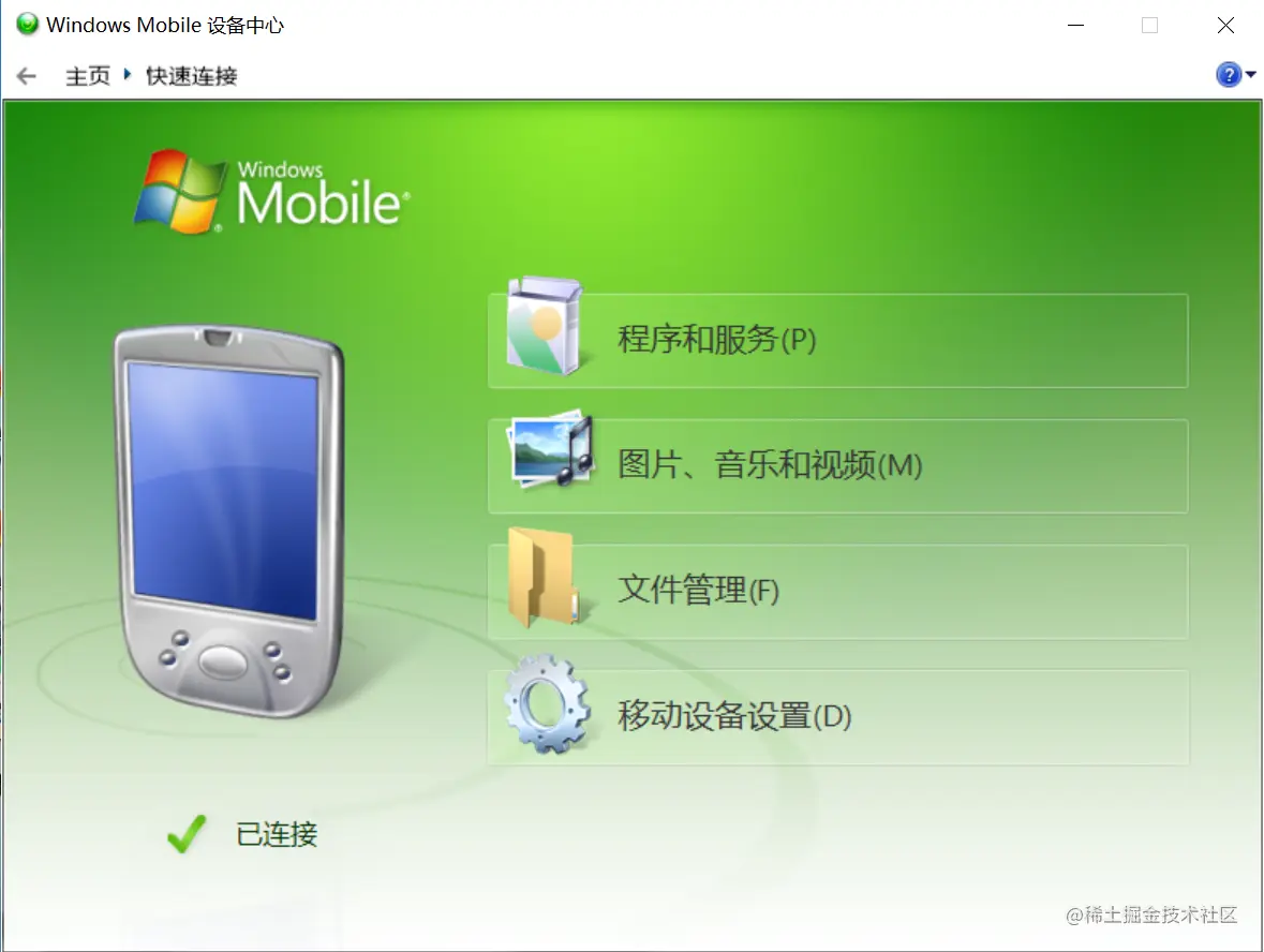 Windows Mobile Device Center 一个桌面应用程序,它允许Windows电脑与移动设备进行通信。Windows 7 中替代 Microsoft ActiveSync (R) 管理 Windows 移动设备,如Pocket PC、Windows CE、Windows Mobile和Windows Phone等。Microsoft已经停止更新并从其官方网站上删除了相关下载链接。