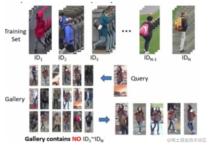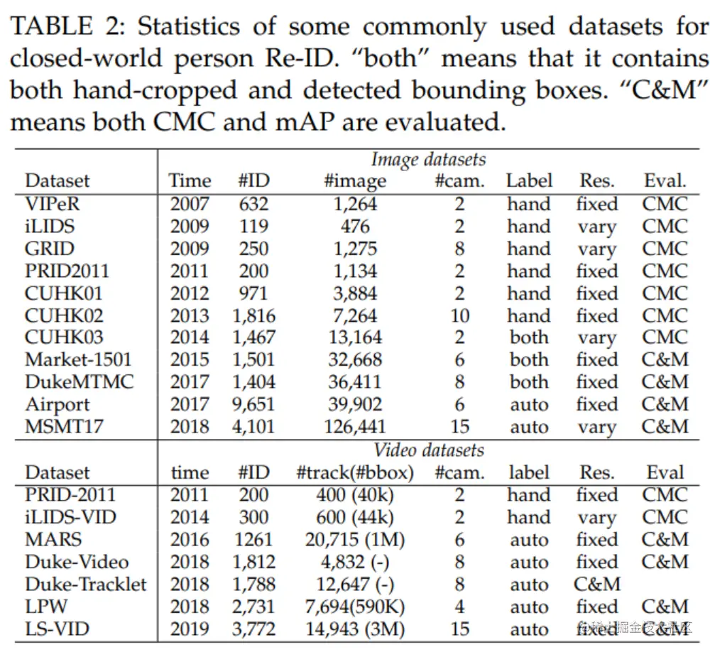 ReID作为匹配任务在测试时会用到两个数据集,Query sets 和Gallery sets,主要有以下特征:ReID数据集:1.数据集分为训练集、验证集、Query sets、Gallery sets 2.数据集通常是通过人工标注或者检测算法得到的行人、车辆图片,目前与检测独立,每个行人或车辆为一个类别子集 3.在训练集上进行模型的训练,得到模型后对Query与Gallery中的图片提取特征计算相似度,对于每个Query在Gallery中找出前N个与其相似的图片 4.训练、测试中目标身份不重复