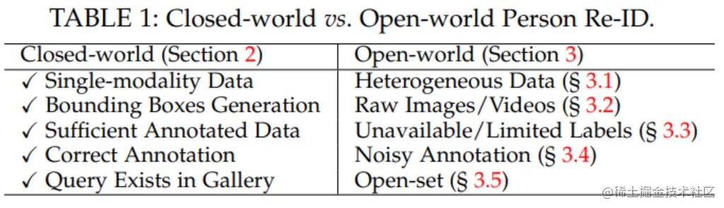 现阶段的reid问题主要分为两大类:closed-world和open-world。closed-world重在研究,主要是从一大堆行人或车辆的bounding box图片中去检索目标,而open-world重在“落地”,主要是直接从视频中去检索目标,或者是偏向无监督、弱监督学习。以下是两个world的具体区别: