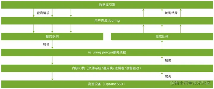 技术优势:应用程序通过统一的标准系统调用来使用 io_uring。相比传统的 Linux Native AIO,io_uring 消除了仅支持 Direct IO 的限制以及额外的内存拷贝开销;相比用户态框架SPDK,io_uring 可复用 Linux 内核的标准驱动,无需额外的用户态驱动开发,应用场景更通用,编程接口更友好。