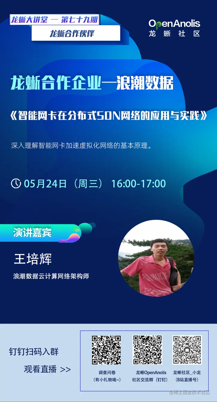 本周「龙蜥大讲堂」预告来啦!我们邀请了浪潮数据云计算网络架构师王培辉分享 《智能网卡在分布式 SDN 网络的应用与实践》 主题演讲,精彩多多,快来扫码入群,预定前排小板凳观看直播!