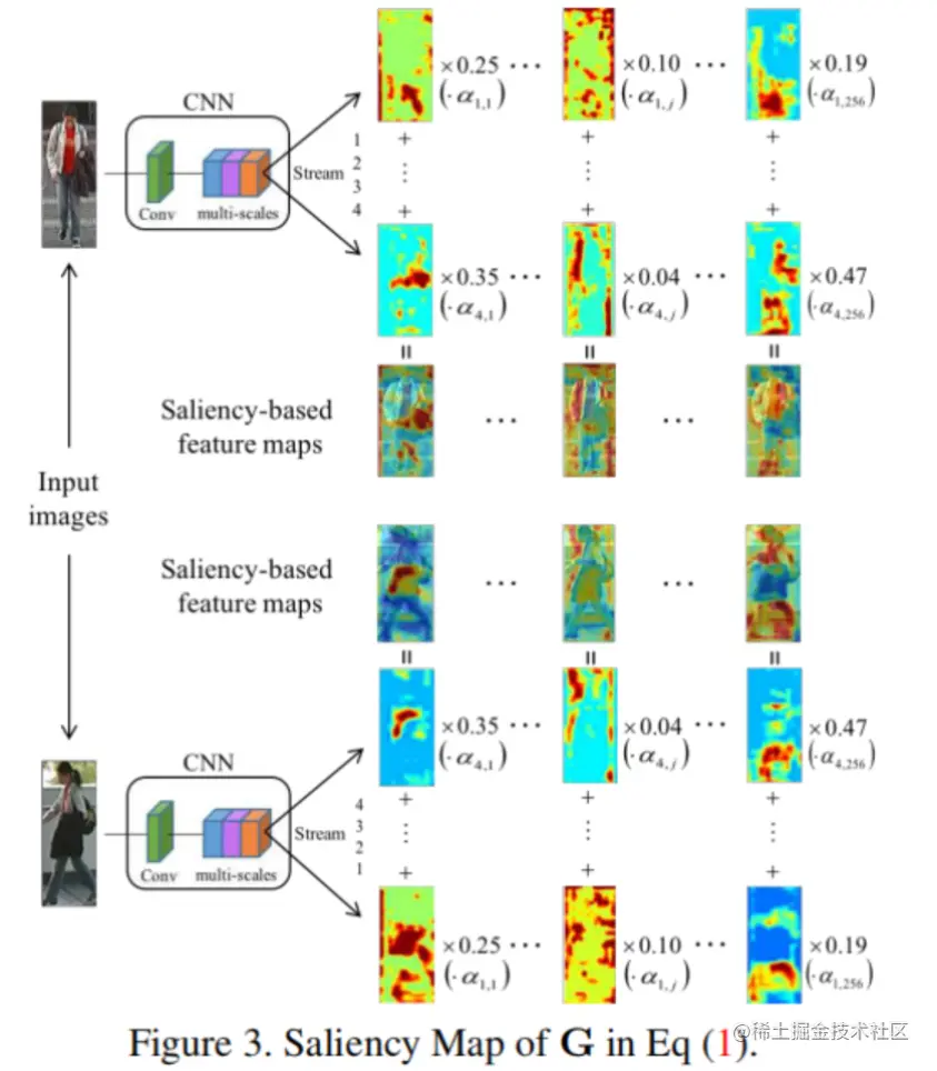提出了该层用于融合多尺度流层的输出。直观地说,通过前一层处理的输出,产生的数据通道具有冗余信息,一些通道可能捕获到相对重要的人员信息,而其他通道可能只对背景上下文建模。因此,本文利用基于显著性的学习策略,自动发现并强调提取出高度区分模式的通道,如头部、身体、手臂、衣服、包等信息,如图3所示。因此,我们假设*Fi⋆_表示每个分支中第1−个流(1≤i≤4)的输入特征图,_Fij_表示_Fi⋆*的第j个通道,即(1≤j≤256),输出特征图表示为G,将融合四种流;Gj表示G的第j个通道图,计算方法为: