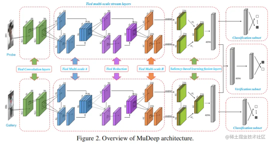 作者提出了一种多尺度深度学习模型(MuDeep),旨在学习多尺度上的区别特征表示,并使用自动确定的尺度权重进行组合(图1(b))。更具体地说,MuDeep网络架构是基于Siamese网络,但关键是能够学习不同尺度的特征,并评估它们对跨摄像机匹配的重要性。这是通过引入两种新的层来实现的:multi-scale stream layers(多尺度流层),通过分析多尺度的人图像来提取图像特征;以及saliency-based learning fusion layer(基于显著性的学习融合层),它有选择性地学习融合多尺度的数据流,生成MuDeep中每个分支更具区别性的特征。作者还在网络的中间层引入了一对分类损失,以监督多尺度特征学习。
