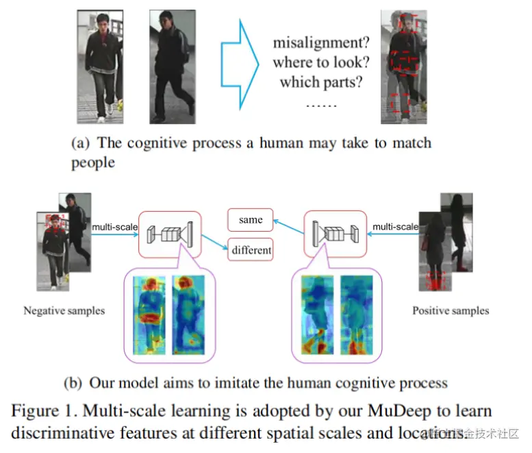 学习判别特征表示是深度重识别模型的关键目标,这些特征需要在多个尺度上进行计算。以图1(a)中的两幅图像为例。在粗糙的层面上,衣服的颜色和文本信息非常相似;因此,人类会进入更精细的尺度,通过细微的局部差异(例如发型、鞋子和图1中左边人夹克上的白色条纹)得出结论,这是两个不同的人。
