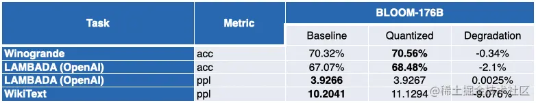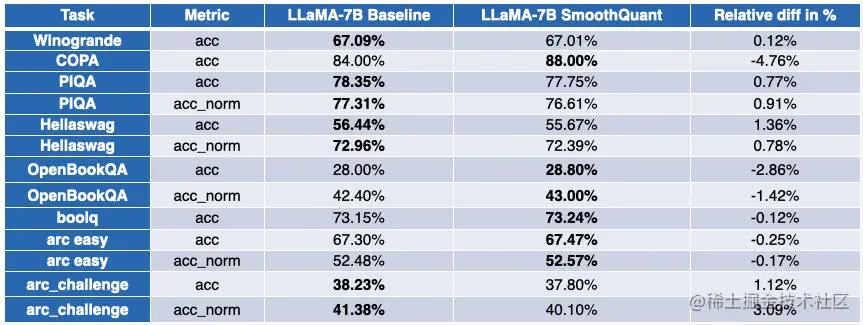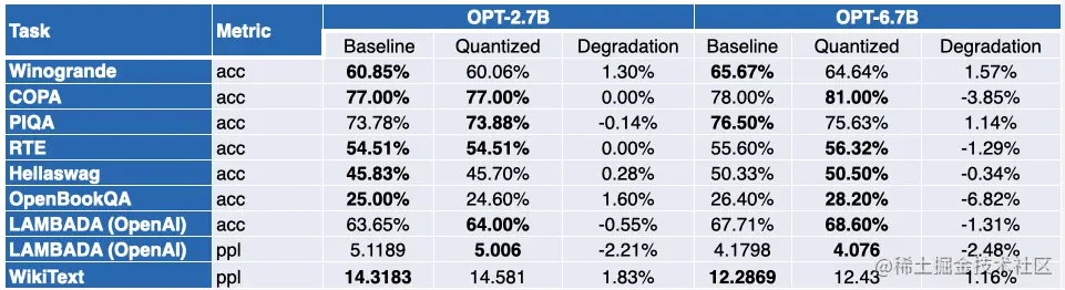 如你所见,OPT 模型非常适合 SmoothQuant 量化。模型比预训练的 16 位模型约小 2 倍。大多数指标都会有所改善,而那些没有改善的指标仅有轻微的降低。