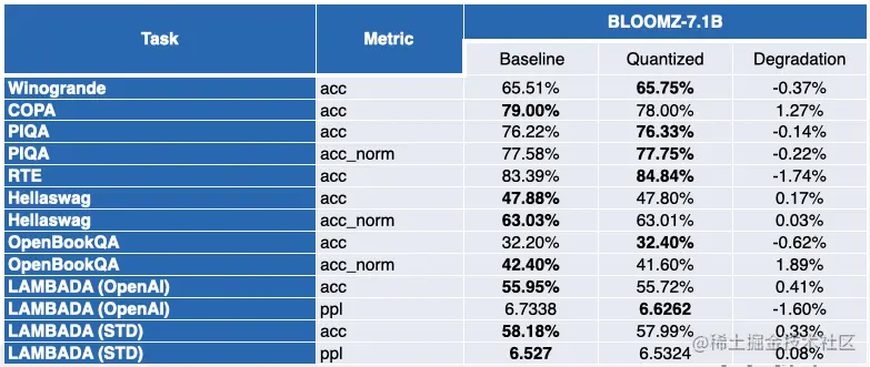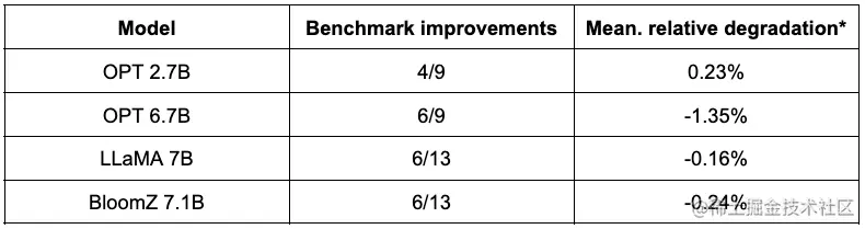 下表总结了他们的发现。第二列展示了量化后性能反而得到提升的任务数。第三列展示了量化后各个任务平均性能退化的均值 (* 负值表示量化后模型的平均性能提高了)。你可以在文末找到详细结果。