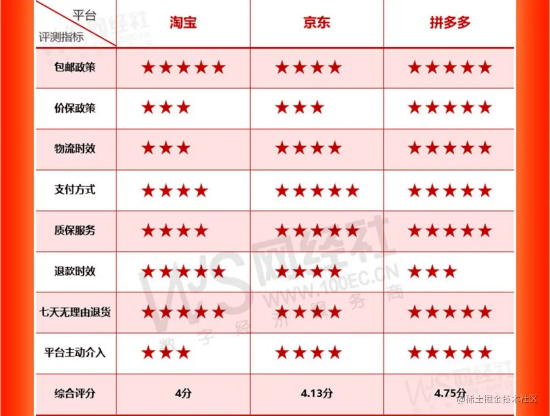 网经社在《三大零售电商售后服务评测报告》中对淘宝、拼多多和京东进行了横向对比,涵盖包邮政策、价保服务、物流时效、支付方式、质保服务、退款时效、七天无理由退货、平台主动介入等8个指标。结果可能超出了一些人的认知,拼多多得4.75分,排名第一;京东得4.13分,排名第二;淘宝得4分,排在第三。