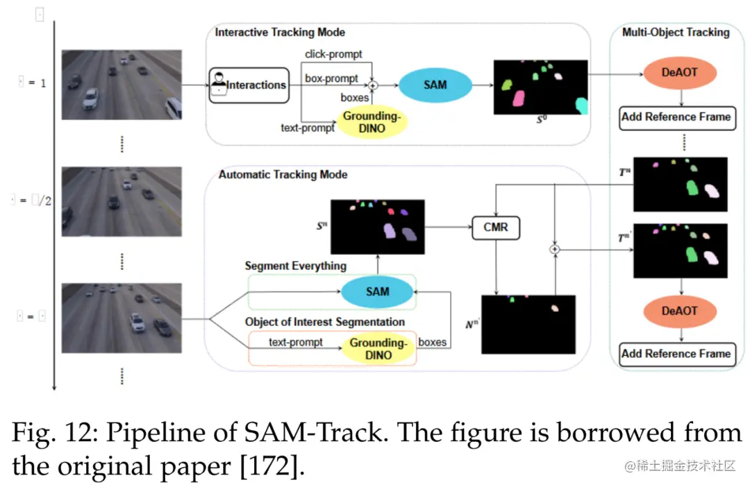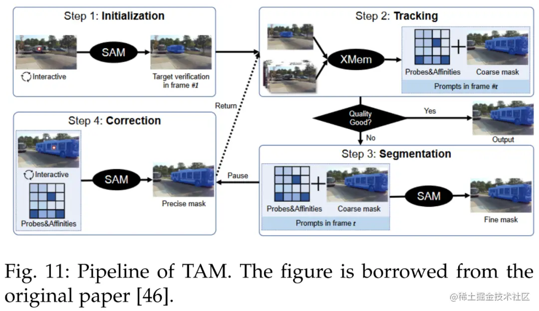 SAM 在 VOT 领域做出了杰出贡献。参考文献 [46] 中引入了跟踪一切模型(Track Anything Model, TAM),高效地在视频中实现了出色的交互式跟踪和分割。下图 11 为 TAM pipeline。