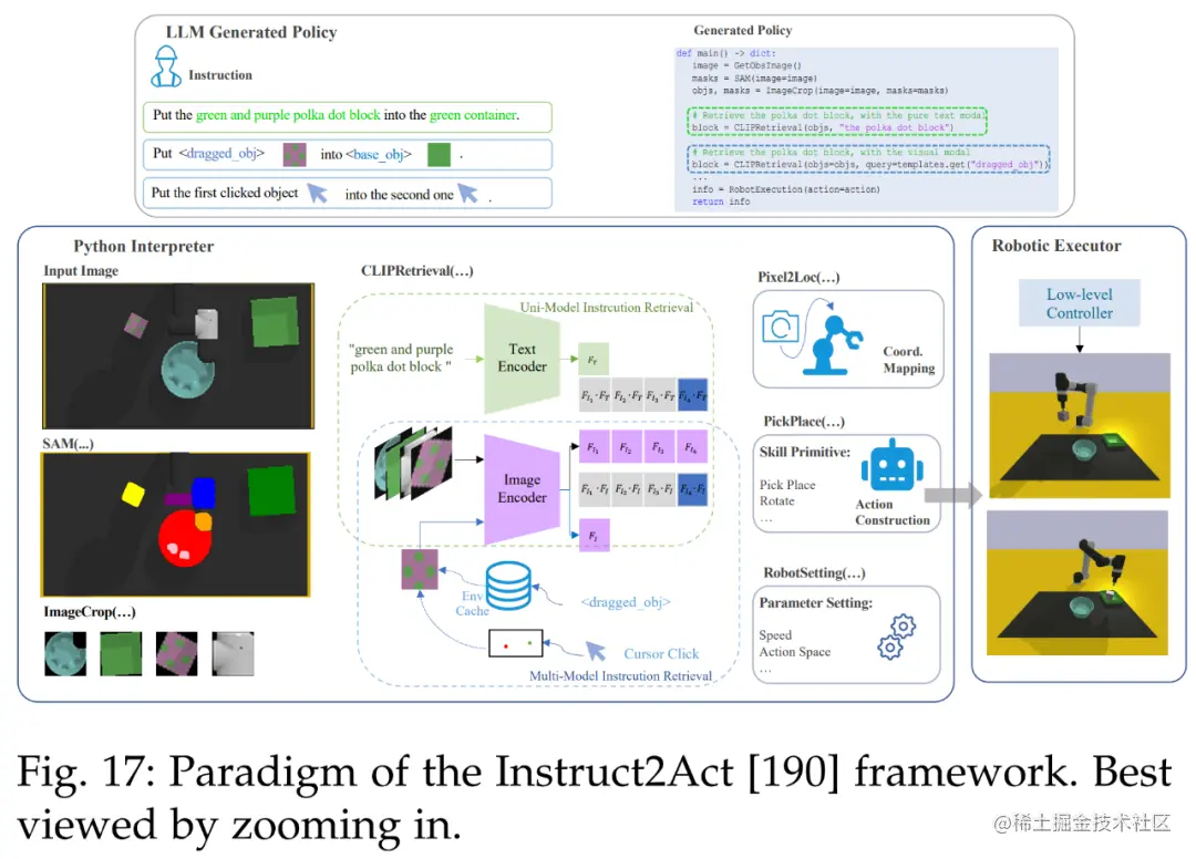 然后是机器人。下图 17 展示了 Instruct2Act [190] 的整体流程。在感知部分,预定义的 API 用于访问多个基础模型。SAM [20] 准确定位候选对象,CLIP [13] 对它们进行分类。该框架利用基础模型的专业知识和机器人能力将复杂的高级指令转换为精确的策略代码。