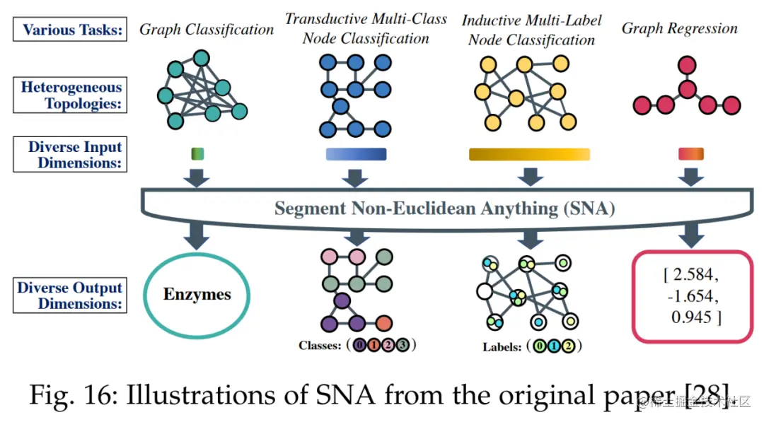 其次是非欧式域。为了为不同任务处理不同特征维度,下图 16 中所示的 SNA 方法引入了一个专门的可精简图卷积层。该层可以根据输入的特征维度进行通道的动态激活或停用。